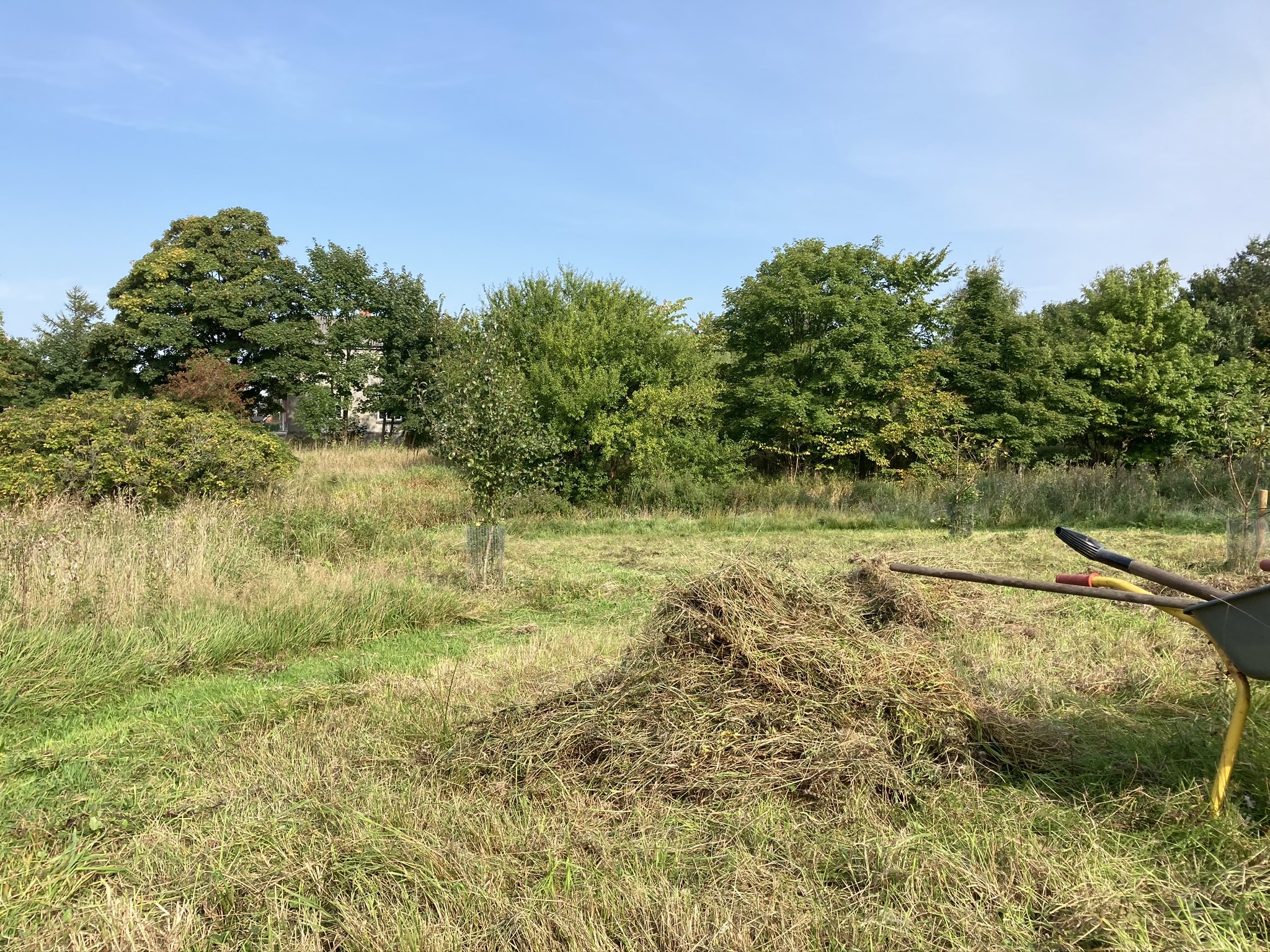 Langt græs kan slås med buskrydder, skiveskære eller le. Det er tidskrævende at slå med le, til gengæld er det hyggeligt havearbejde, der ikke larmer og ikke kræver benzin. Du kan slå arealet i små bidder ad gangen efterhånden som du har tid og lyst til det. Hvis der kun er tale om få kvadratmeter, kan det simpelthen klippes med en hæksaks eller hækklipper. Lad det afklippede materiale ligge et par dage, så blomsterfrøene kan drysse af.
